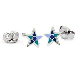 Die Ohrstecker mit Sternen haben unterschiedliche Farbgebungen in blau Tönen in den lackierten Sternzacken. Die Silberohrstecker sind im Zentrum des Sterns mit einem Zirkoniastein in blau verziert. Die Schmuckstücke sind glänzend poliert verarbeitet.